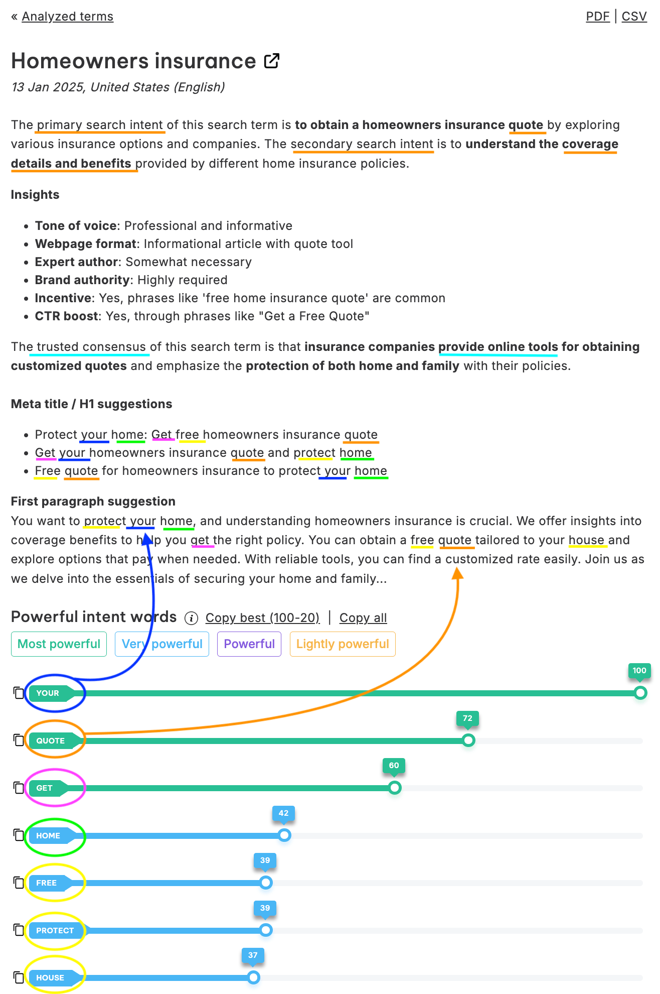 Use the suggested (meta) title and paragraph, or sprinkle the most powerful intent words into your content manually. In this way you'll get the semantics closer to what your visitors are really searching for.